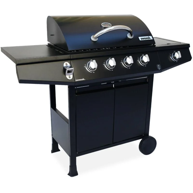 Toute la structure de ce barbecue à gaz est en acier de haute qualité recouvert de peinture résistante à la chaleur. Les brûleurs sont en acier inoxydable L'allumage est électronique par piézo Les 5 brûleurs peuvent fonctionner indépendamment. Un thermomètre sur le capot pour surveiller la cuisson sans ouvrir le couvercle. Pratique, le barbecue est équipé d'un décapsuleur.