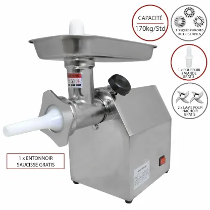 <p> Avec sa capacité énorme de 170kg par heure, ce hachoir à viande est un outil indispensable dans les restaurants, hôtels, bouchers et bien plus!</p><p> Avec le poussoir à viande GRATIS, ce hachoir durable ne pourrait pas être plus simple à utiliser. 3 disques perforés de différentes tailles inclus, ainsi que les 2 lames vous permet de créer les burgers, boulettes et viande haché que vous souhaitez et bien plus. Nettoyer ce hachoir en tout facilité et maintenir une hygiène grâce à son design en Inox.</p><p><b>Caractéristique du produit:<p></b><ul><li>Ce hachoir vous permet de hacher une quantité ÉNORME de 170kg par heure </li><li>Le poussoir à viande vous permet de hacher la viande plus facilement</li><li>3 disques performés et les 2 lames vous permettent de hacher votre viande de façon efficace et rapide pour vous aider à créer les burgers, boulettes et viande haché que vous souhaitez </li><li>Ce hachoir durable a conçu pour être compact et robuste, idéal pour les cuisines très occupés</li><li>Facile a nettoyage et entretenir grâce à son extérieur Inox</li><li>Parfait pour les environnements de travail commercial dont la restauration, hôtels et bouchers</li><li>Entonnoir Saucisses OFFERT</li><li>Garantie électrique 24 mois </li><p><b>Spécifications: <p></b><ul><li>Matériel: Acier Inox</li><li>Puissance: 850W</li><li>Tension: 220V – 240V / 50Hz / 60Hz</li><li>Capacité: 170kg/h</li><li>Hauteur: 38cm / 380mm</li><li>Longueur: 38.5cm / 385mm</li><li>Largeur: 21cm / 210mm</ul><p><b>Contenu de la boite: <p></b><ul><li>1 x Hachoir à