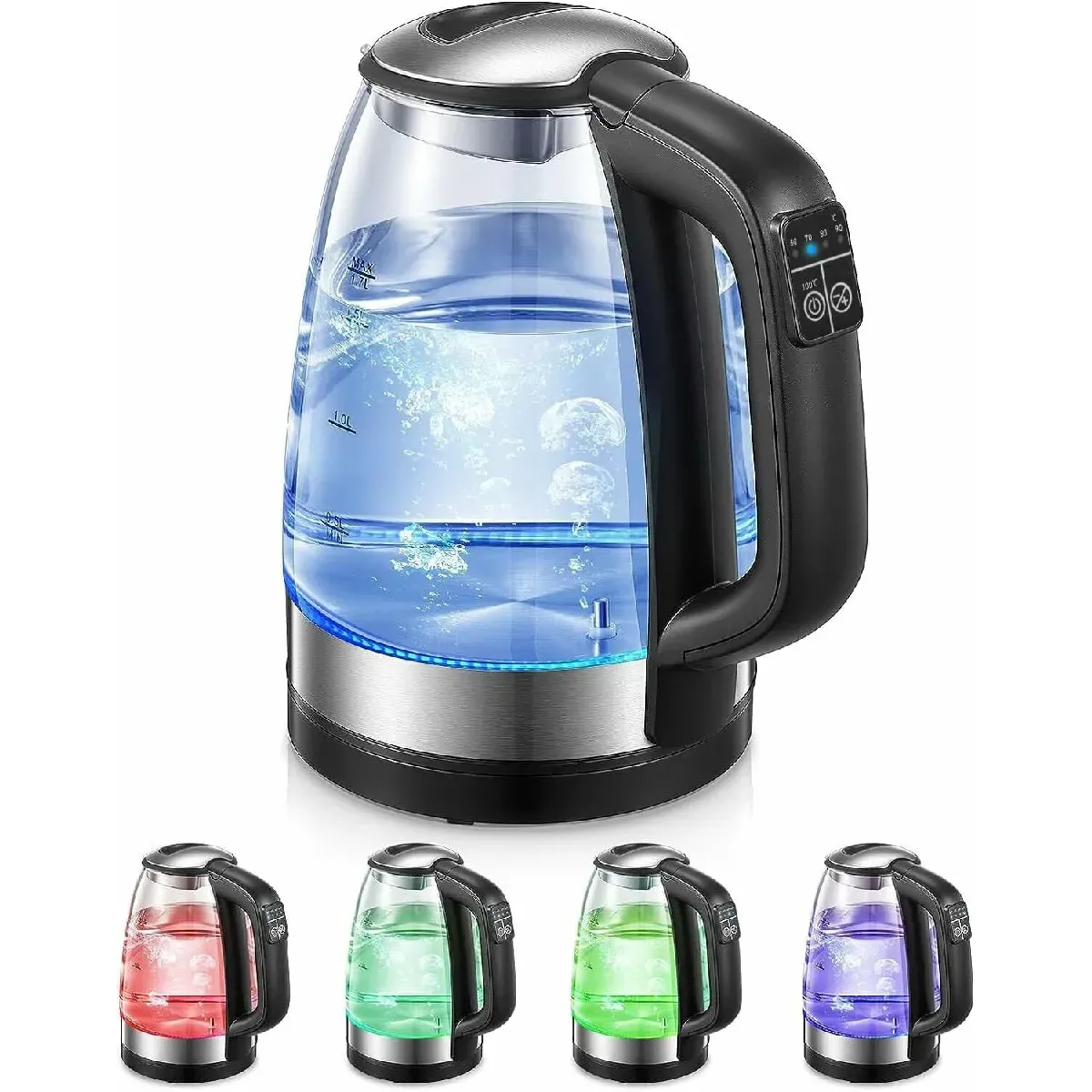 Cette bouilloire électrique en verre a des lumières LED de 5 couleurs différentes. Non seulement il est beau, mais il dispose également de 5 options de température : 50 °C à 100 °C, qu'il s'agisse de café, de thé ou d'eau chaude, il vous offre toujours la température idéale, vous permettant de profiter de la meilleure saveur de vos boissons.La bouilloire a une puissance puissante de 2200W, et elle peut terminer le travail d'eau bouillante avec une grande capacité de 1.7L en 3-7 minutes. Gagnez plus de temps pour vous et votre famille et apportez une expérience de cuisine plus parfaite.Appuyez sur le bouton de l'interrupteur et maintenez-le enfoncé pendant 3 secondes, la bouilloire en verre avec réglage de la température maintiendra l'eau à la température sélectionnée pendant 2 heures. L'eau chaude est toujours disponible, vous pouvez donc profiter de votre prochaine boisson sans la réchauffer.bouilloire pratique et élégante a un design exceptionnel et est fabriquée en verre borosilicate de qualité alimentaire et en acier inoxydable. Haute résistance aux rayures, sans BPA et protège brièvement la bouilloire contre l'abrasion. Son design élégant fait de cette bouilloire le complément parfait à votre cuisine.Avec arrêt automatique et fonctions de protection contre les incendies secs, il vous protège, vous et votre famille pendant l'utilisation. La bouilloire s'éteint automatiquement lorsque la température atteint la température choisie ou lorsque l'eau est presque sèche. Échelle de niveau d'eau, base antidérapante à 360°, peut être utilisée à la fois avec la main gauche et la main droite.